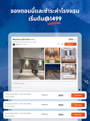 การค้นหาที่พักที่ตรงใจในราคาที่คุ้มค่านั้นมักเป็นเรื่องที่ซับซ้อนและใช้เวลา แพลตฟอร์มค้นหาโรงแรมของเราถูกออกแบบมาเพื่อพลิกโฉมประสบการณ์การจองของคุณให้ง่ายดายและมีประสิทธิภาพยิ่งขึ้น ด้วยฐานข้อมูลที่ครอบคลุมโรงแรมกว่าล้านแห่งทั่วโลก เราช่วยให้คุณสามารถเปรียบเทียบข้อเสนอจากเว็บไซต์จองชั้นนำนับร้อยแห่งได้อย่างรวดเร็ว ไม่ว่าจะเป็น Klook, Kkday, Trip.com, Booking.com, Expedia, HotelTonight, Vrbo, Traveloka, Agoda, Airbnb, Priceline หรือ Tripadvisor แพลตฟอร์มนี้รวบรวมทุกตัวเลือกมาไว้ในที่เดียว เพื่อให้คุณมั่นใจว่าได้รับข้อเสนอที่ดีที่สุดสำหรับการเดินทางครั้งต่อไปของคุณ ช่วยประหยัดทั้งเวลาและค่าใช้จ่ายในการวางแผนการเดินทางของคุณ
